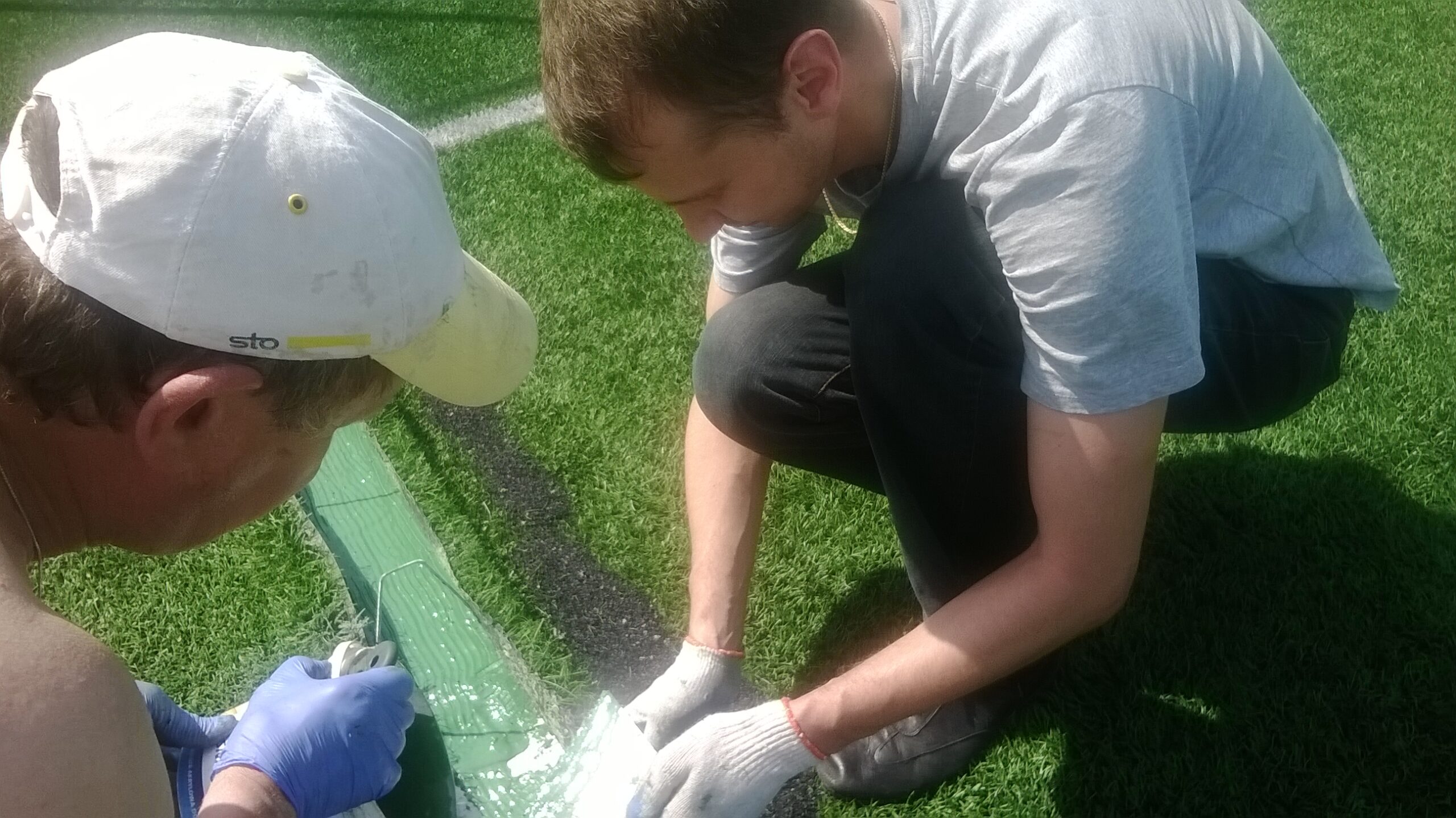 Czwartym etapem jest równomierne rozprowadzenie granulatu po całym boisku, eliminując w ten sposób nierówności i fałdy w nawierzchni oraz zaczesanie trawy syntetycznej dzięki czemu źdźbła trawy wracają do swojej pionowej pozycji.